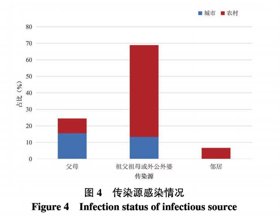 本研究結(jié)果中女患兒約占總數(shù)的68.89%,考慮與生理解剖結(jié)構(gòu)因素有關(guān)?本研究中患兒發(fā)病部位多見(jiàn)于肛周(73.33%),與其他研究結(jié)果相同[3,5],考慮原因是幼兒皮膚薄嫩,便后擦拭的反復(fù)摩擦造成局部皮膚屏障受損,容易導(dǎo)致HPV的感染?另外,本研究中農(nóng)村患兒占比較高,這與父母外出打工,幼兒長(zhǎng)期留守有關(guān)?他們大多都由祖父母一輩老年人照料,衛(wèi)生習(xí)慣和防病理念較差,而且近幾年老年人性病發(fā)病率逐年升高,主要集中在農(nóng)村[6-7],如果患有尖銳濕疣的老人不注意清潔衛(wèi)生,在手部攜帶病毒的情況下護(hù)理小孩,給小孩擦拭清潔外陰及肛門(mén),可能導(dǎo)致幼兒感染?