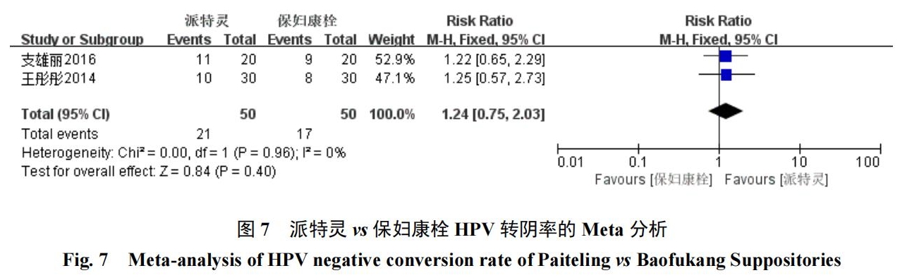 2項(xiàng)研究[19-20]報道了派特靈與保婦康栓的療效對比,采用固定效應(yīng)模型(I2=0,P=0.96),結(jié)果顯示派特靈組HPV轉(zhuǎn)陰率為42%(21/50),保婦康栓組HPV轉(zhuǎn)陰率為34%(17/50);