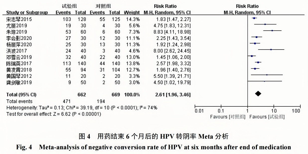 2組HPV轉(zhuǎn)陰率對比具有統(tǒng)計(jì)學(xué)意義 [RR=2.61,95% CI(1.96,3.46),P<0.00001]。見圖 4。