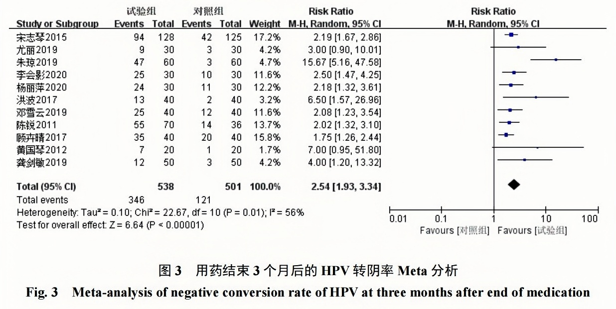11項(xiàng)研究[6-14,17-18]報道了用藥結(jié)束3個月后的HPV轉(zhuǎn)陰率,采用隨機(jī)效應(yīng)模型(I2=56%,P=0.01),結(jié)果顯示派特靈組HPV轉(zhuǎn)陰率為64.31%(346/538),隨訪對照組HPV轉(zhuǎn)陰率為24.15%(121/501);