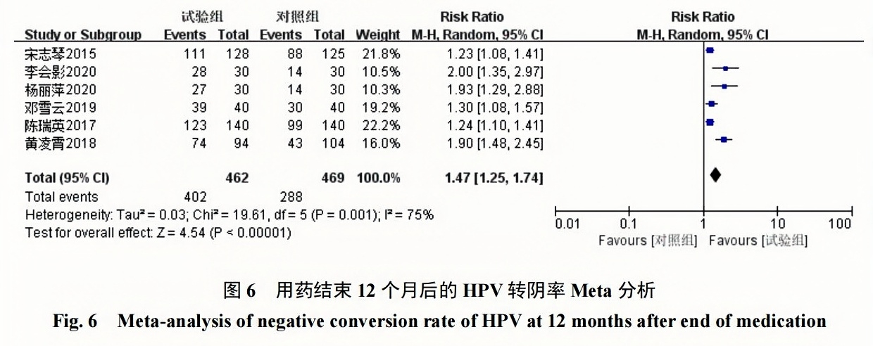 2組HPV轉(zhuǎn)陰率對比具有統(tǒng)計(jì)學(xué)意義[RR=1.47,95%CI(1.25,1.74),P<0.00001]?見圖6?