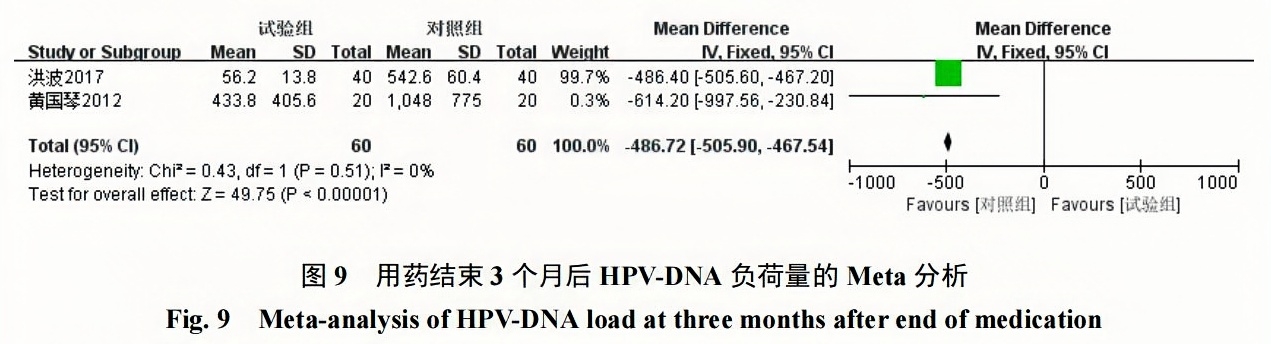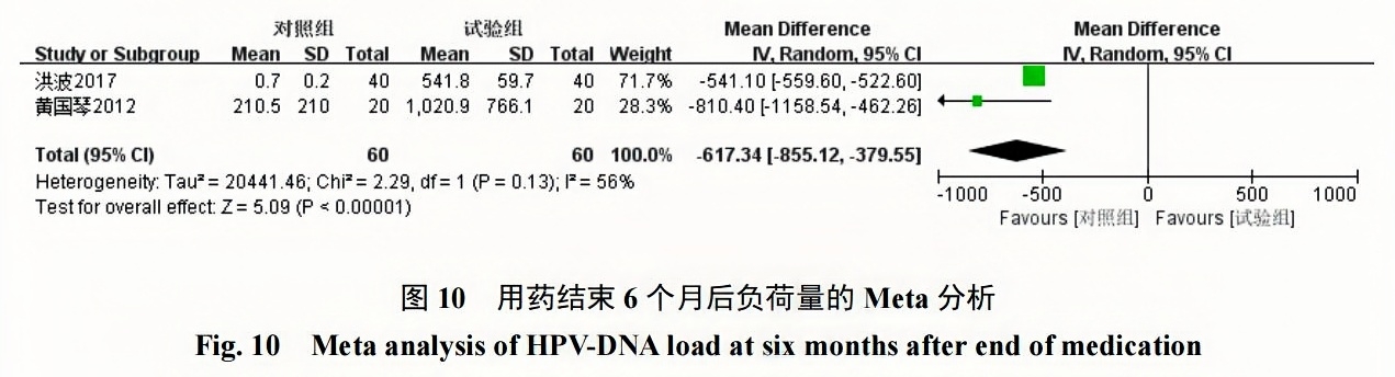 Meta結(jié)果顯示,派特靈組用藥結(jié)束后3個月及6個月HPV-DNA負(fù)荷量明顯低于隨訪對照組,2組在2個時間段HPV-DNA負(fù)荷量對比均具有統(tǒng)計(jì)學(xué)意義[用藥結(jié)束后3個月:MD=?486.72,95%CI(?505.90,?467.54),P<0.00001;