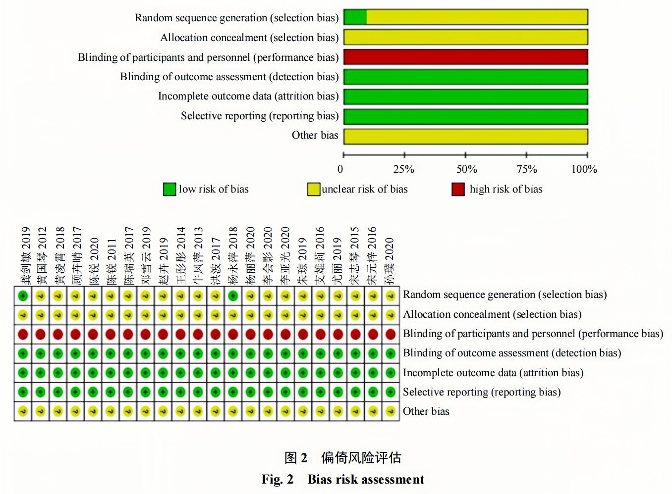 因納入的22項(xiàng)研究均無足夠信息明確是否存在高低偏倚,故均判定為未知風(fēng)險。具體偏倚風(fēng)險評估見圖2。
