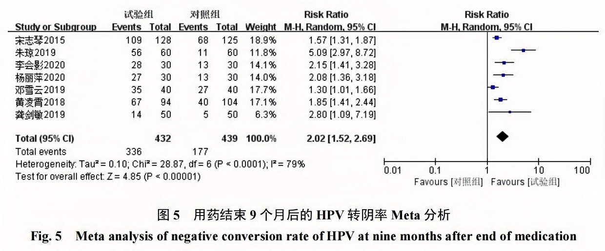 2組HPV轉(zhuǎn)陰率對比具有統(tǒng)計(jì)學(xué)意義[RR=2.02, 95%CI(1.52,2.69),P<0.00001]。見圖5。