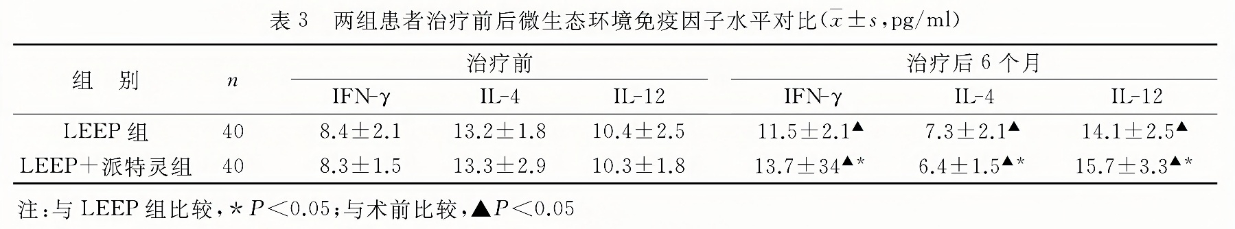 LEEP+派特靈組治療后的微生態(tài)恢復(fù)率為97.5%,顯著高于LEEP組的82.5%(P<0.05);