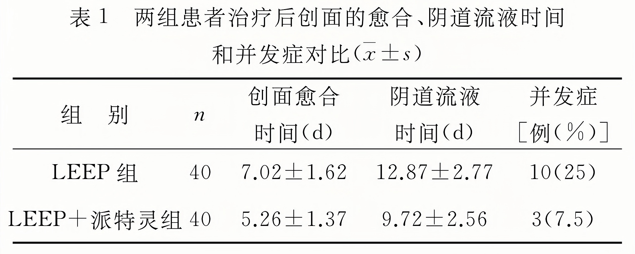 LEEP+派特靈組的創(chuàng)面愈合和陰道流液時(shí)間均顯著短于LEEP組(P<0.05);
