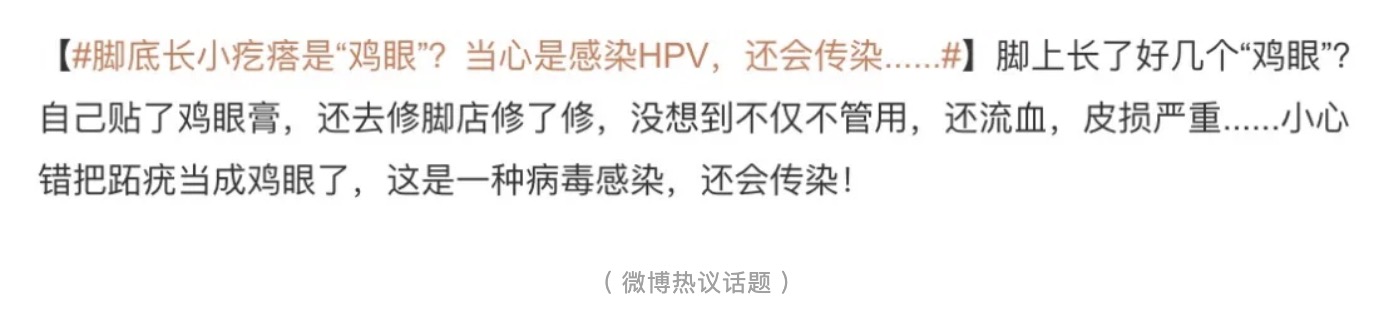 最近,微博上的一條熱搜引起了大家的關(guān)注——“腳底長小疙瘩是“雞眼”?當(dāng)心是HPV!”。